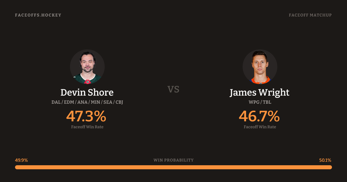 These two are closely matched in overall FO% (47.3% vs 46.7%). Shore wins 46.7% vs left-shot opponents — Wright shoots left.
