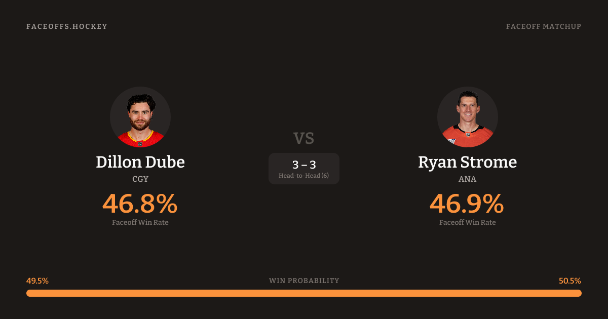 Dillon Dube holds a +3.0% FO% edge overall. Dube wins 44.2% vs right-shot opponents — Strome shoots right.