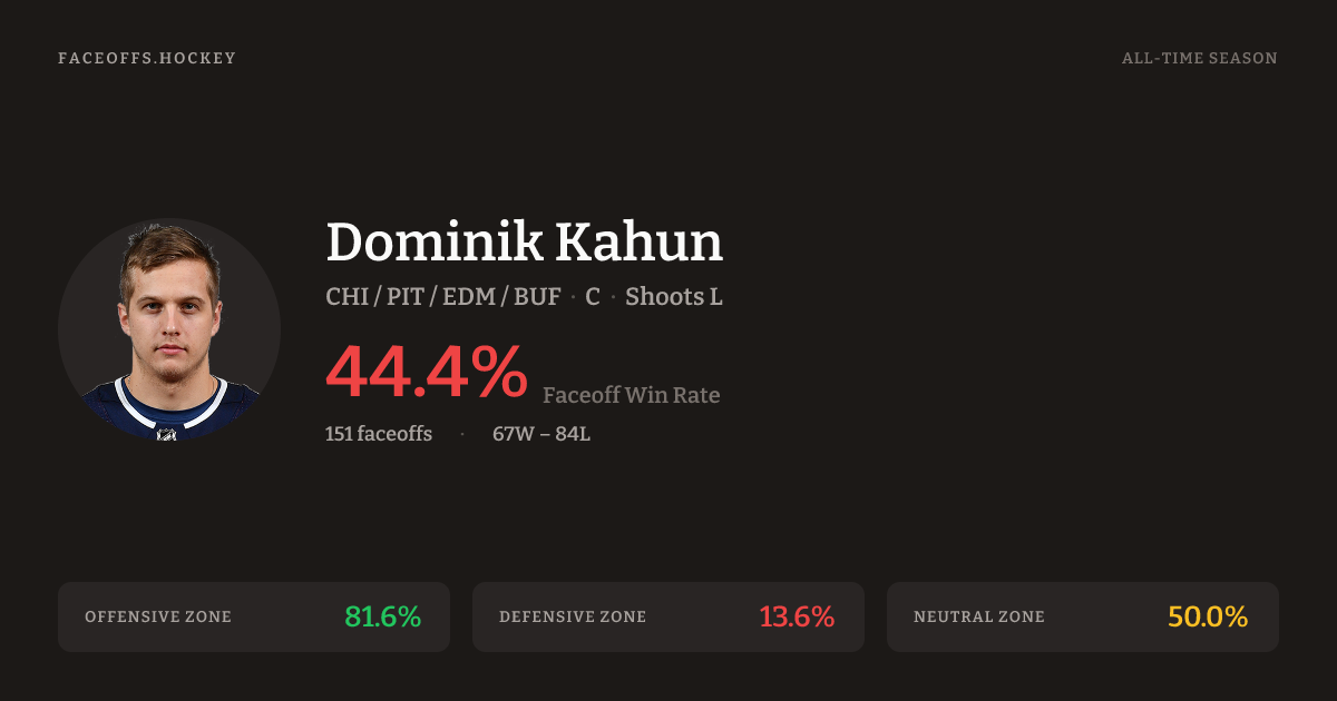 Dominik Kahun has a career faceoff win percentage of 44.8% across 154 faceoffs. Best zone: Offensive (82.4%).