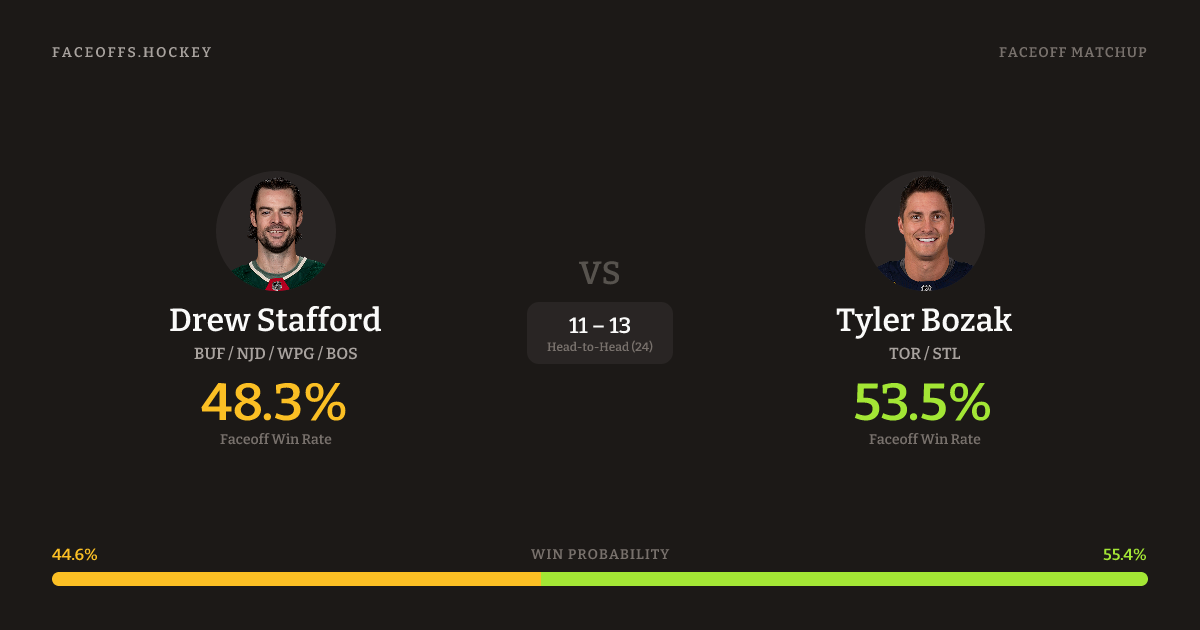 Tyler Bozak holds a +5.2% FO% edge overall. Look for Bozak on defensive-zone draws (75% H2H, 8 meetings). Stafford wins 46.7% vs right-shot opponents — Bozak shoots right.
