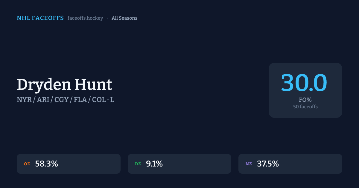 Dryden Hunt has a 2018-19 faceoff win percentage of 0.0% across 3 faceoffs in the 2018-19 season. Best zone: Neutral (0.0%).