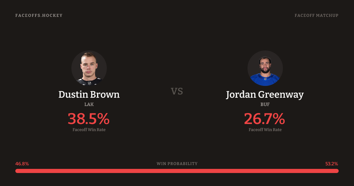 Dustin Brown holds a +4.0% FO% edge overall. Brown wins 37.7% vs left-shot opponents — Greenway shoots left.