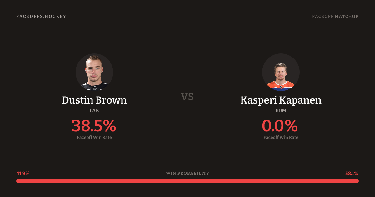 Dustin Brown holds a +1.5% FO% edge overall. Brown wins 40.5% vs right-shot opponents — Kapanen shoots right.