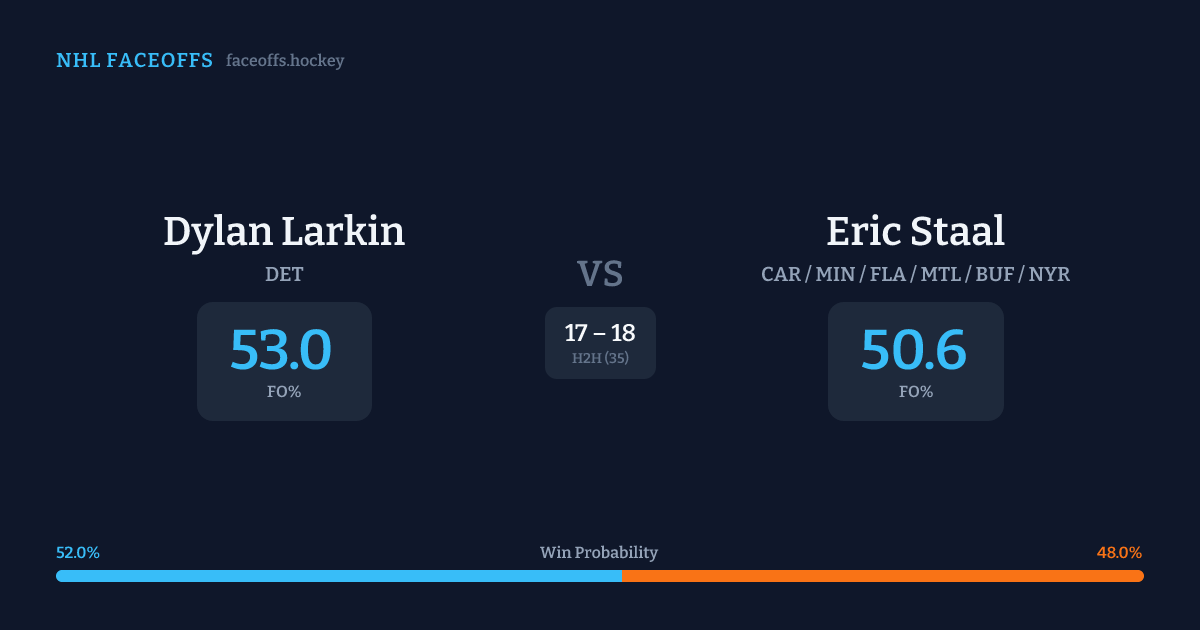 Larkin shoots left. Staal is 50.1% vs left-shot opponents (672).