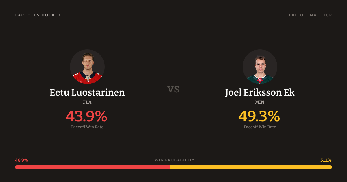 Joel Eriksson Ek holds a +7.5% FO% edge overall. Look for Luostarinen on offensive-zone draws (75% H2H, 4 meetings). Luostarinen wins 42.9% vs left-shot opponents — Ek shoots left.