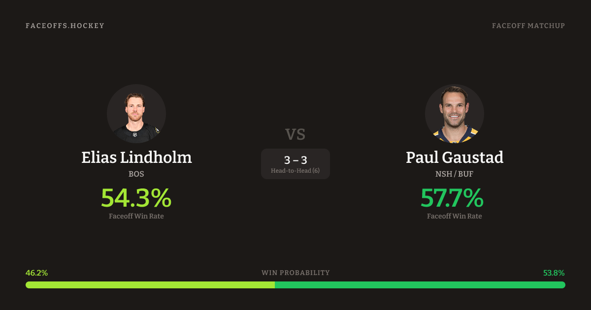 Paul Gaustad holds a +6.2% FO% edge overall. Look for Lindholm on offensive-zone draws (67% H2H, 3 meetings).