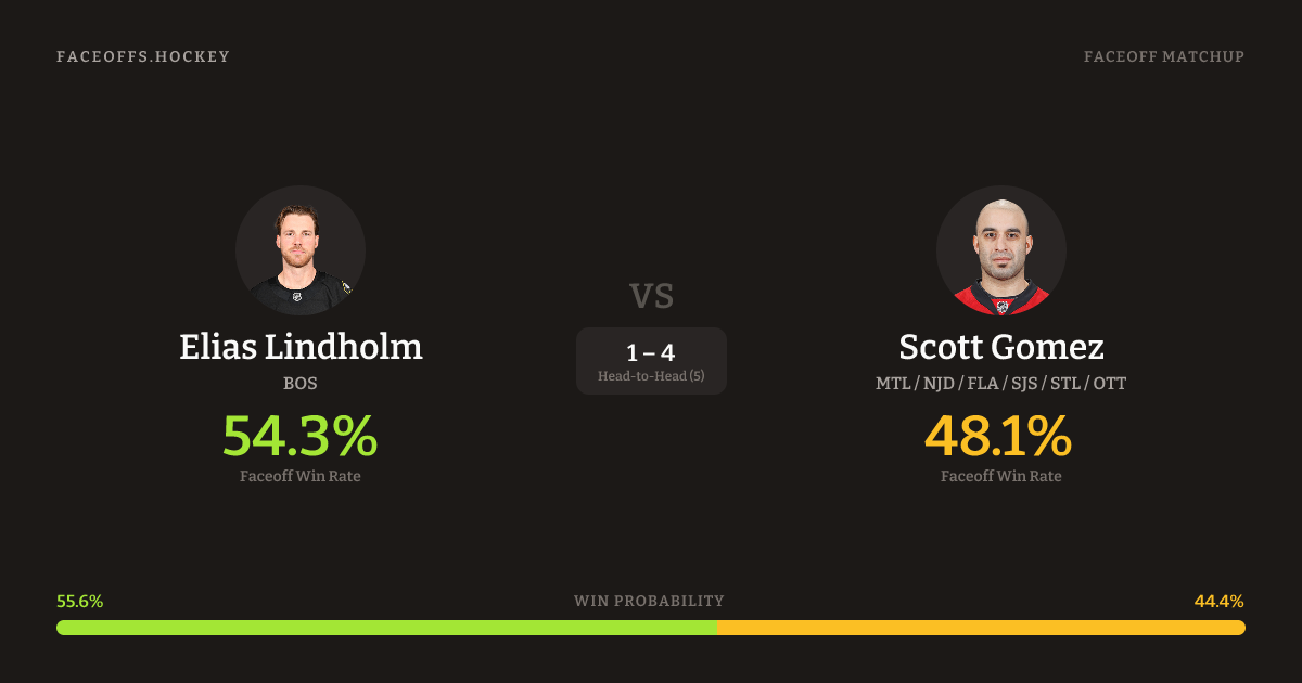 Elias Lindholm holds a +5.7% FO% edge overall. Lindholm wins 55.3% vs left-shot opponents — Gomez shoots left.