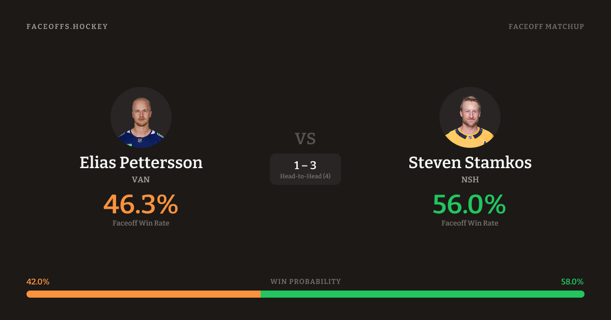 Steven Stamkos holds a +9.5% FO% edge overall. Look for Stamkos on defensive-zone draws (75% H2H, 4 meetings). Pettersson wins 38.0% vs right-shot opponents — Stamkos shoots right.