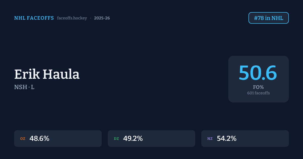 Erik Haula has a 2025-26 faceoff win percentage of 50.6% across 601 faceoffs in the 2025-26 season. Best zone: Neutral (54.2%). Ranked #78 in the league.