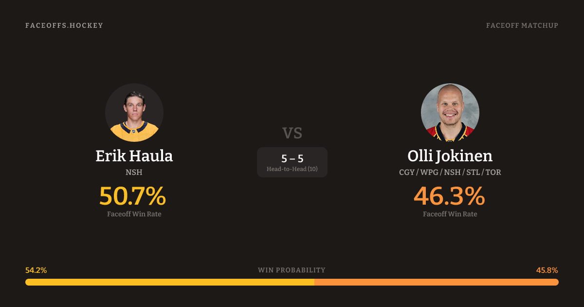 These two are closely matched in overall FO% (46.3% vs 46.0%). Look for Haula on offensive-zone draws (67% H2H, 3 meetings). Haula wins 42.7% vs left-shot opponents — Jokinen shoots left.