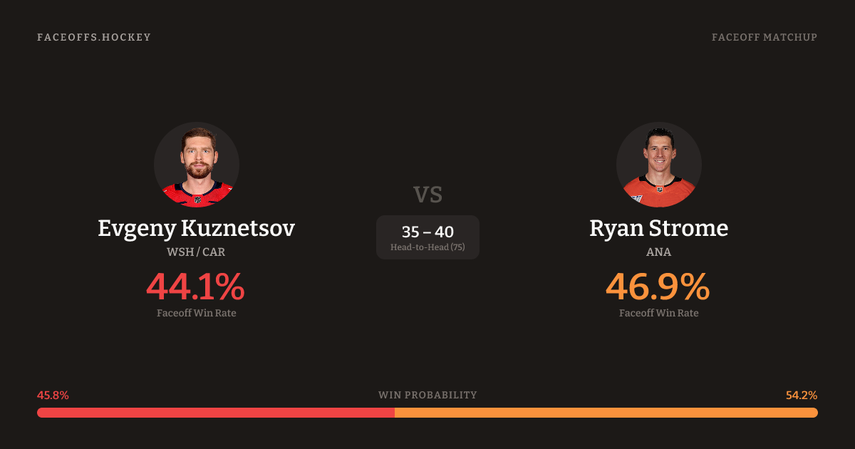 Ryan Strome holds a +8.9% FO% edge overall. Look for Strome on neutral-zone draws (86% H2H, 7 meetings). Kuznetsov wins 38.7% vs right-shot opponents — Strome shoots right.