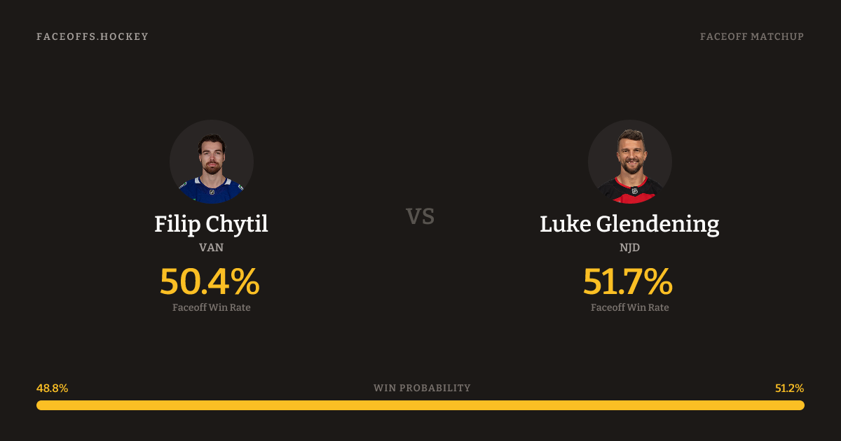 Luke Glendening holds a +10.2% FO% edge overall. Chytil wins 46.8% vs right-shot opponents — Glendening shoots right.