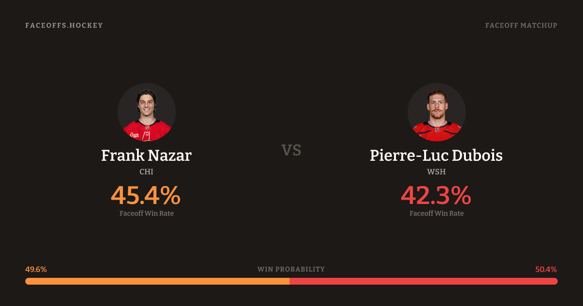 Pierre-Luc Dubois holds a +5.1% FO% edge overall. Look for Dubois on defensive-zone draws (100% H2H, 3 meetings). Nazar wins 45.4% vs left-shot opponents — Dubois shoots left.