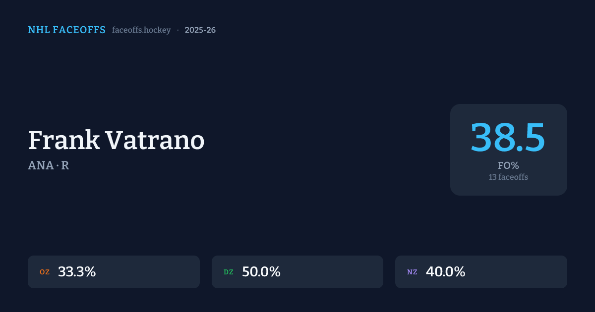 Frank Vatrano has a 2025-26 faceoff win percentage of 38.5% across 13 faceoffs in the 2025-26 season. Best zone: Defensive (50.0%).