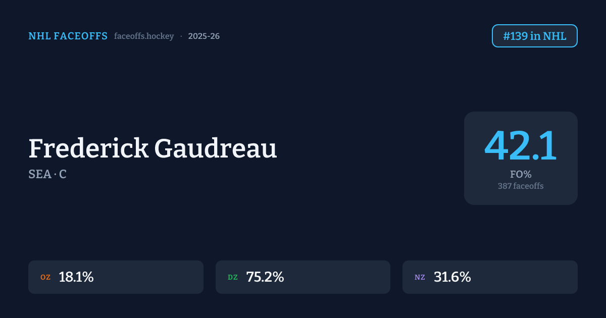 Frederick Gaudreau has a 2025-26 faceoff win percentage of 42.1% across 387 faceoffs in the 2025-26 season. Best zone: Defensive (75.2%). Ranked #139 in the league.