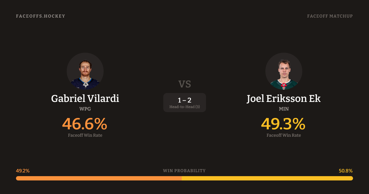 Gabriel Vilardi holds a +2.2% FO% edge overall. Look for Vilardi on offensive-zone draws (60% H2H, 5 meetings).