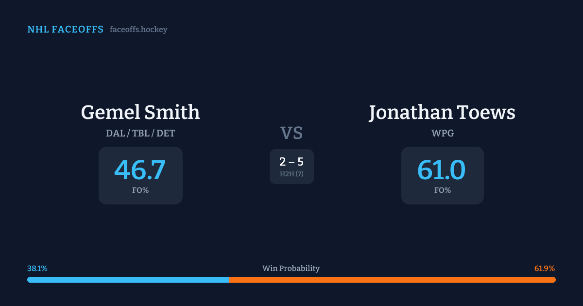 Jonathan Toews holds a +12.5% FO% edge overall. Look for Toews on defensive-zone draws (67% H2H, 3 meetings). Smith wins 40.8% vs left-shot opponents — Toews shoots left.