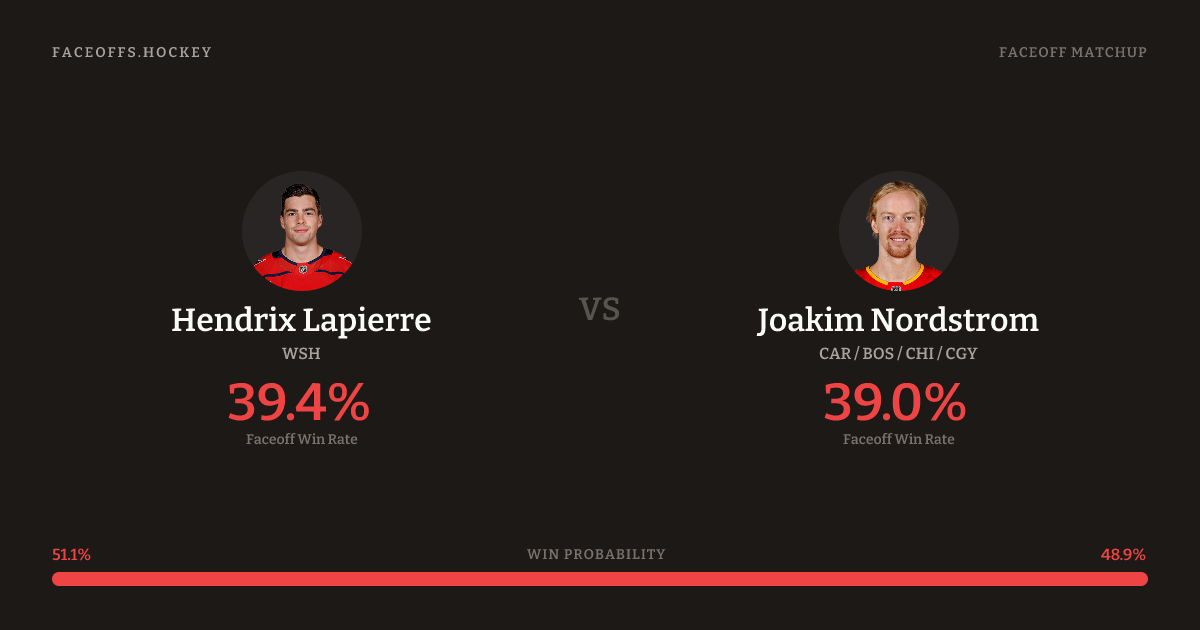 These two are closely matched in overall FO% (38.1% vs 39.0%). Lapierre wins 36.4% vs left-shot opponents — Nordstrom shoots left.