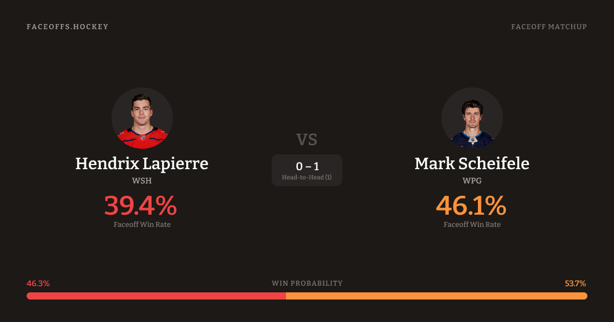 Mark Scheifele holds a +10.6% FO% edge overall. Look for Scheifele on defensive-zone draws (67% H2H, 3 meetings). Lapierre wins 39.3% vs right-shot opponents — Scheifele shoots right.