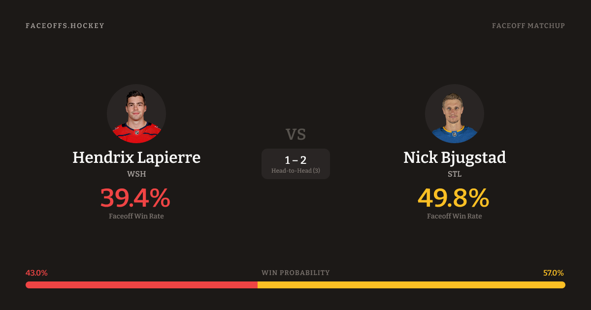Nick Bjugstad holds a +11.7% FO% edge overall. Look for Bjugstad on defensive-zone draws (100% H2H, 4 meetings). Lapierre wins 39.3% vs right-shot opponents — Bjugstad shoots right.