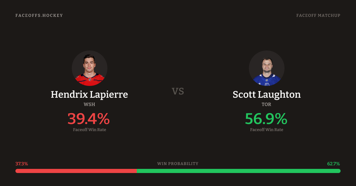 Scott Laughton holds a +11.4% FO% edge overall. Look for Lapierre on defensive-zone draws (67% H2H, 3 meetings). Lapierre wins 36.6% vs left-shot opponents — Laughton shoots left.