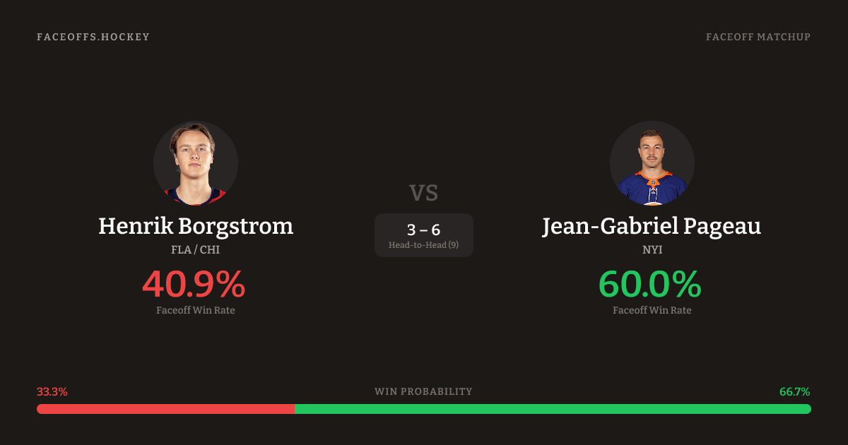 Jean-Gabriel Pageau holds a +15.1% FO% edge overall. Look for Pageau on offensive-zone draws (75% H2H, 4 meetings). Borgstrom wins 39.6% vs right-shot opponents — Pageau shoots right.