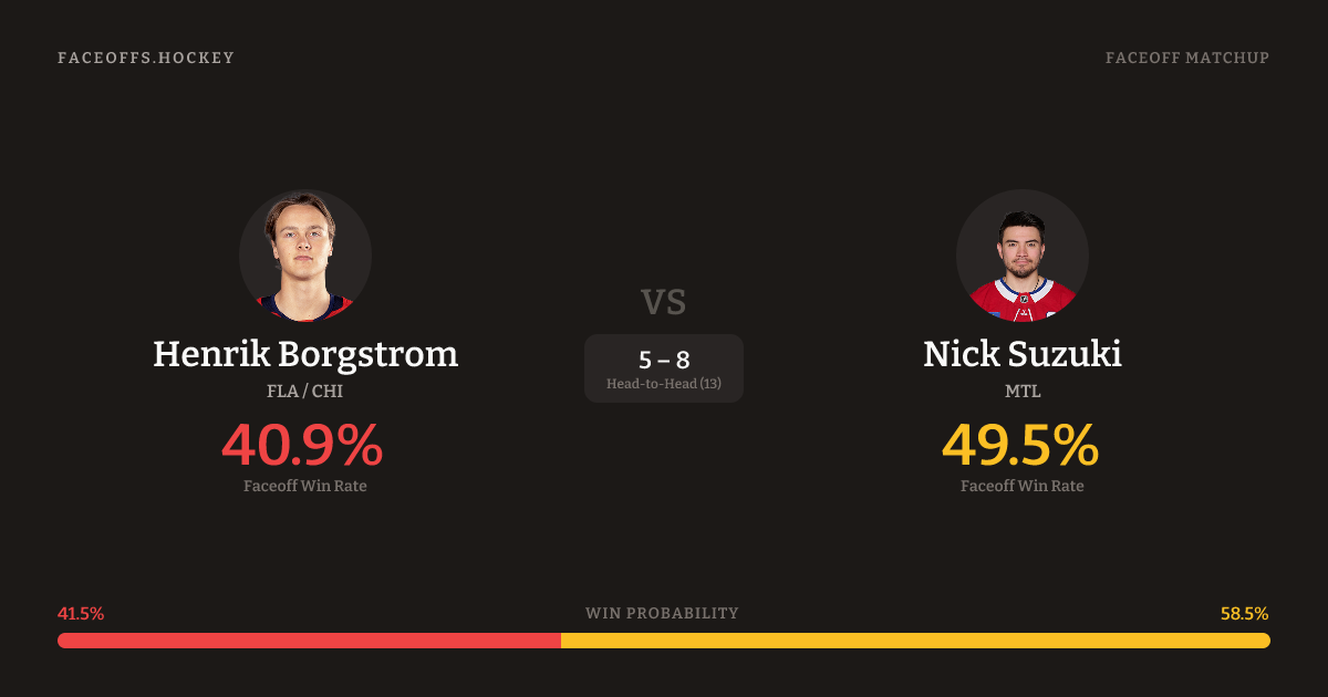 Nick Suzuki holds a +9.4% FO% edge overall. Look for Suzuki on defensive-zone draws (80% H2H, 5 meetings). Borgstrom wins 39.6% vs right-shot opponents — Suzuki shoots right.