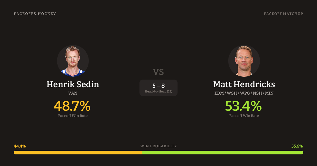 Matt Hendricks holds a +9.4% FO% edge overall. Sedin wins 43.4% vs left-shot opponents — Hendricks shoots left.