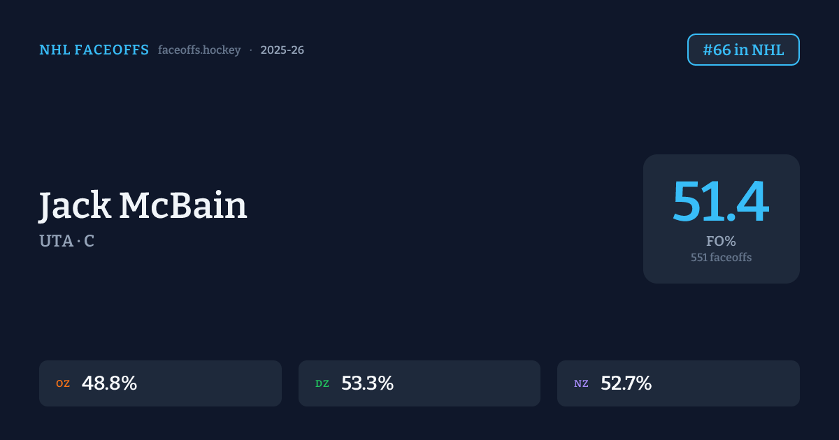 Jack McBain has a 2025-26 faceoff win percentage of 51.4% across 551 faceoffs in the 2025-26 season. Best zone: Defensive (53.3%). Ranked #66 in the league.