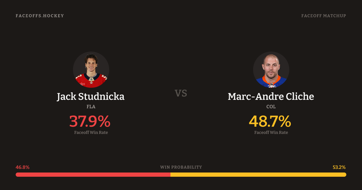Marc-Andre Cliche holds a +3.7% FO% edge overall. Studnicka wins 42.7% vs right-shot opponents — Cliche shoots right.