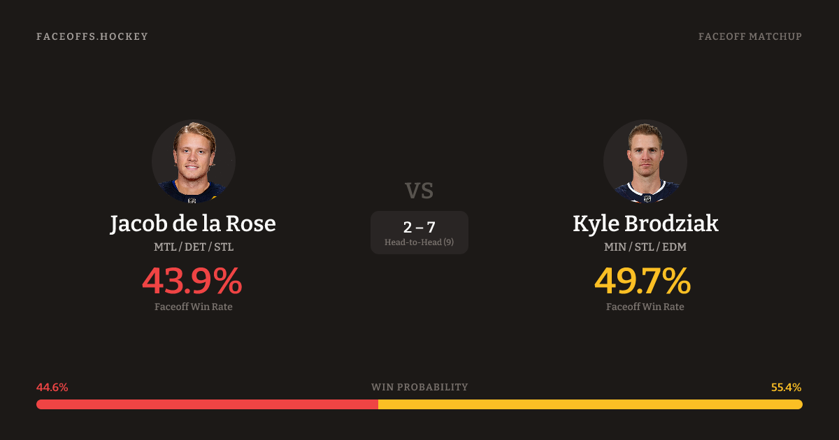 Kyle Brodziak holds a +8.0% FO% edge overall. Look for Brodziak on offensive-zone draws (100% H2H, 3 meetings). Rose wins 38.8% vs right-shot opponents — Brodziak shoots right.
