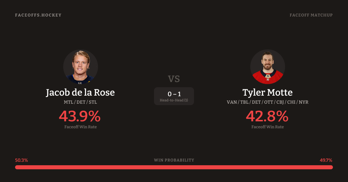 Jacob de la Rose holds a +1.1% FO% edge overall. Rose wins 45.5% vs left-shot opponents — Motte shoots left.
