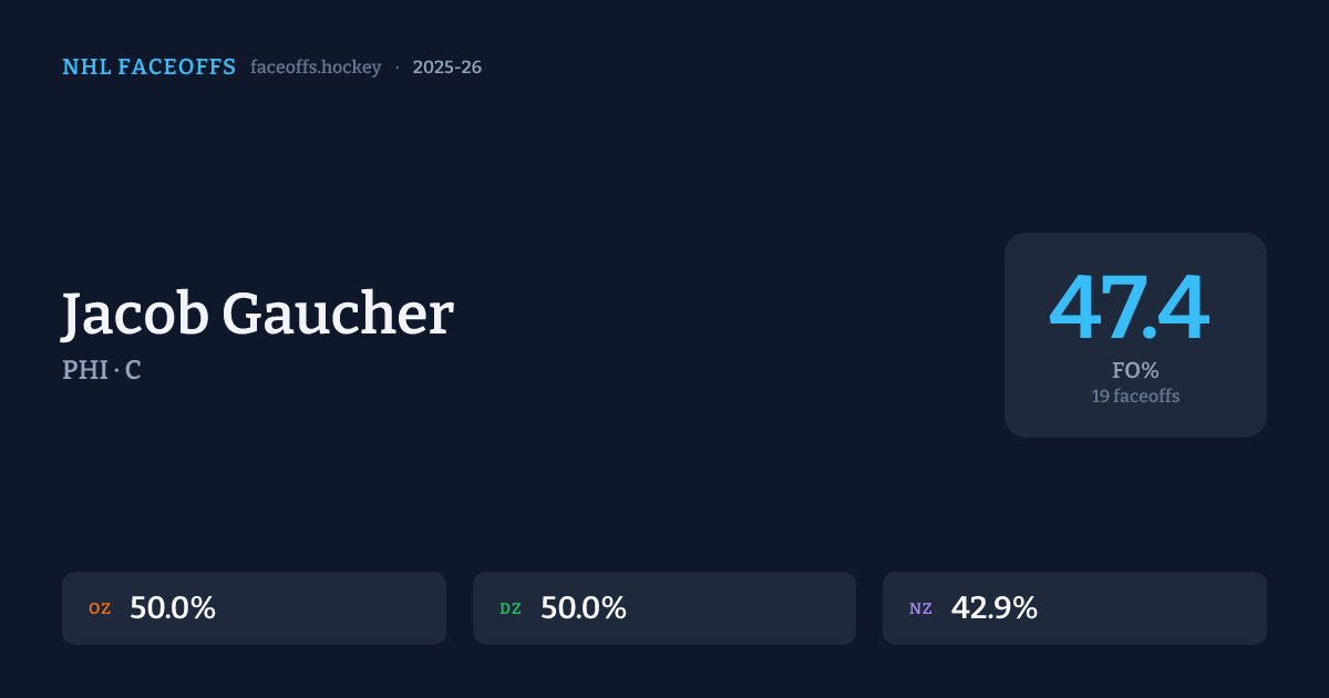 Jacob Gaucher has a 2025-26 faceoff win percentage of 47.4% across 19 faceoffs in the 2025-26 season. Best zone: Defensive (50.0%).