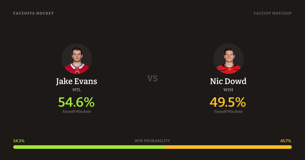 Jake Evans holds a +1.2% FO% edge overall. Look for Dowd on defensive-zone draws (75% H2H, 4 meetings). Evans wins 56.8% vs right-shot opponents — Dowd shoots right.