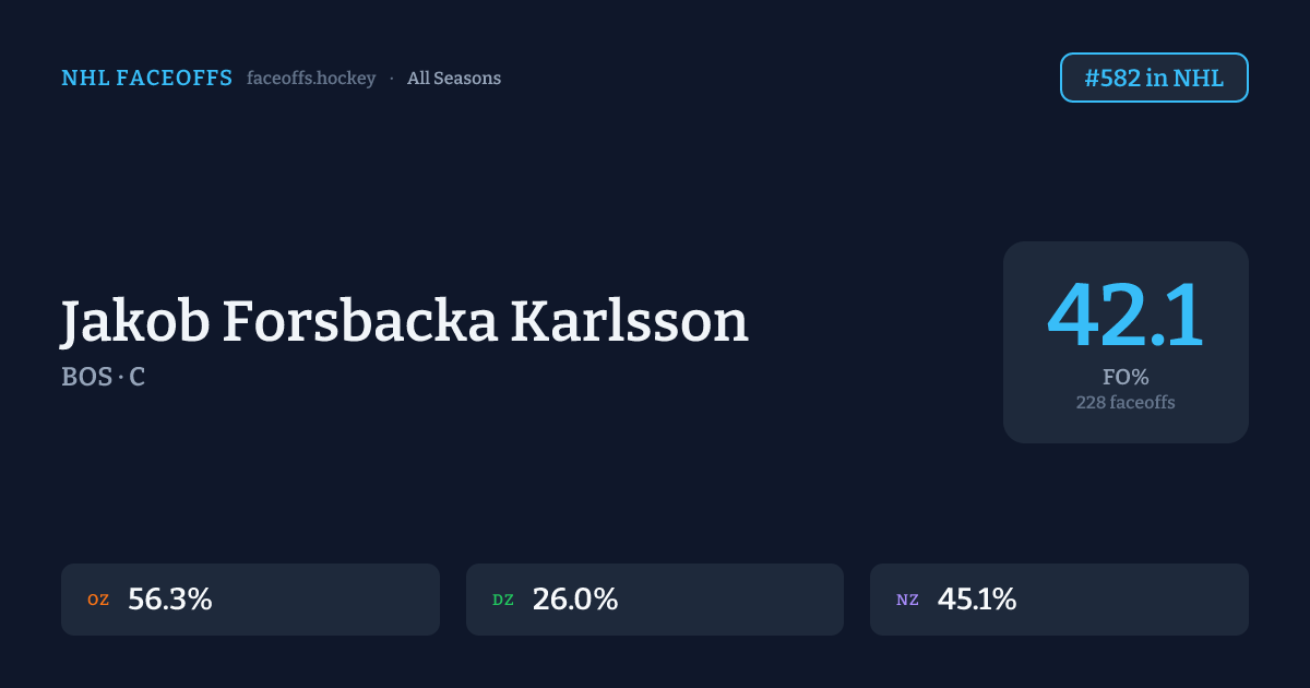Jakob Forsbacka Karlsson has a career faceoff win percentage of 42.1% across 228 faceoffs. Best zone: Offensive (56.3%). Ranked #582 in the league.