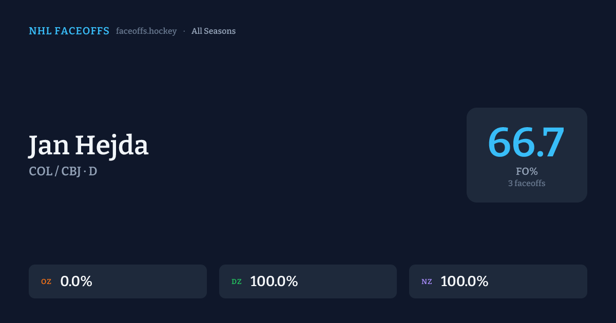 Jan Hejda has a career faceoff win percentage of 66.7% across 3 faceoffs. Best zone: Neutral (100.0%).
