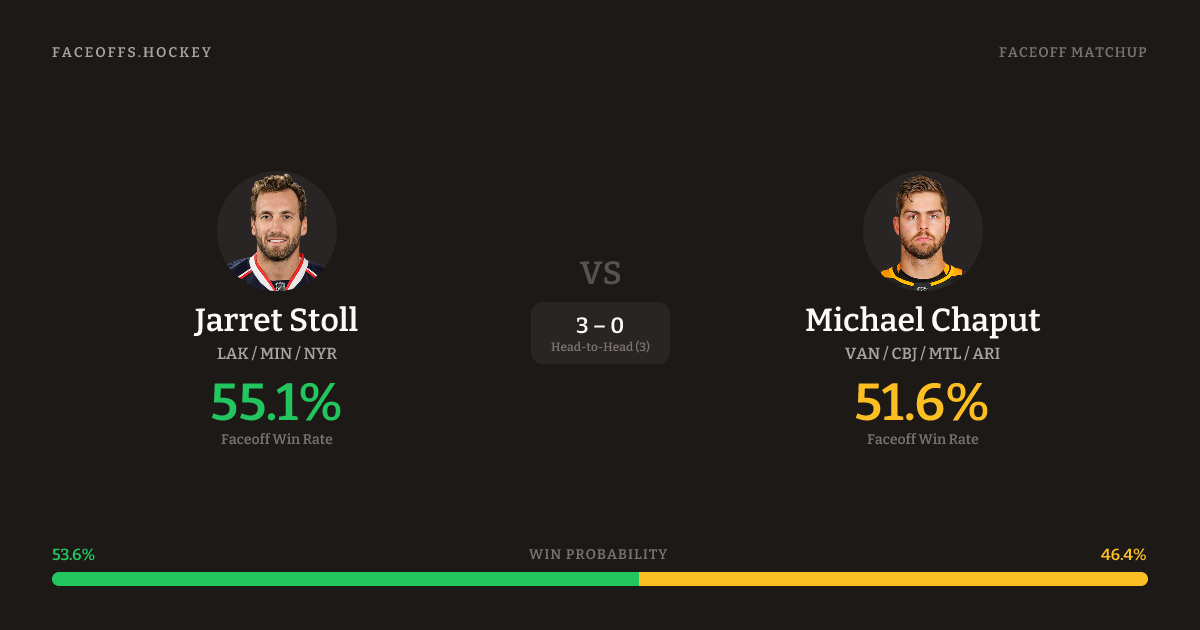Jarret Stoll holds a +3.5% FO% edge overall. Stoll wins 56.4% vs left-shot opponents — Chaput shoots left.