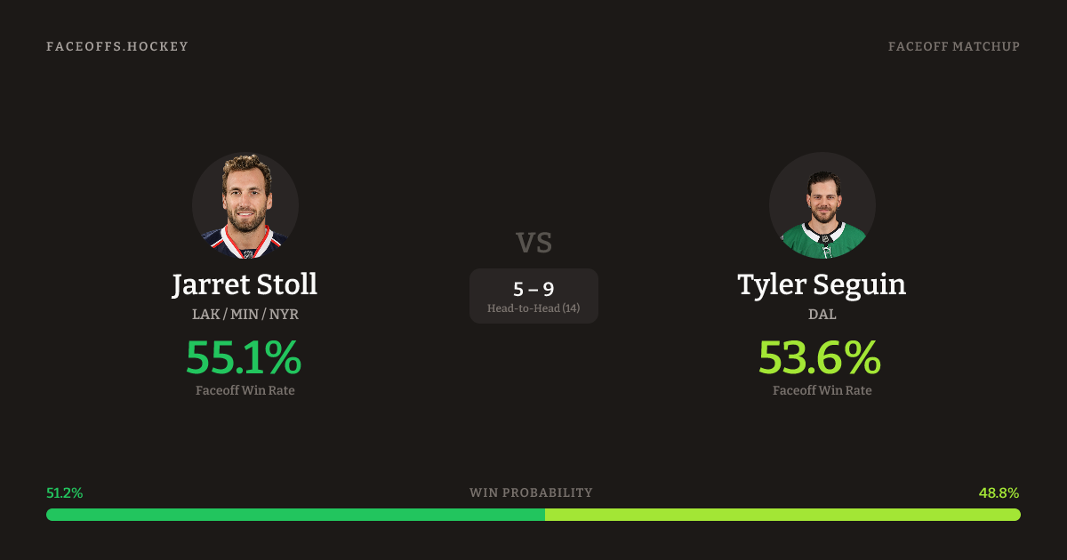 Jarret Stoll holds a +1.5% FO% edge overall. Look for Seguin on offensive-zone draws (100% H2H, 5 meetings).