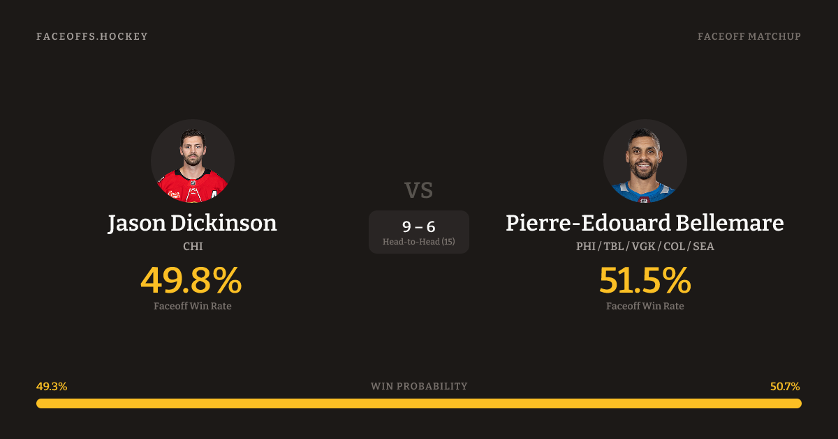Pierre-Edouard Bellemare holds a +9.2% FO% edge overall. Look for Bellemare on neutral-zone draws (67% H2H, 3 meetings). Dickinson wins 42.7% vs left-shot opponents — Bellemare shoots left.