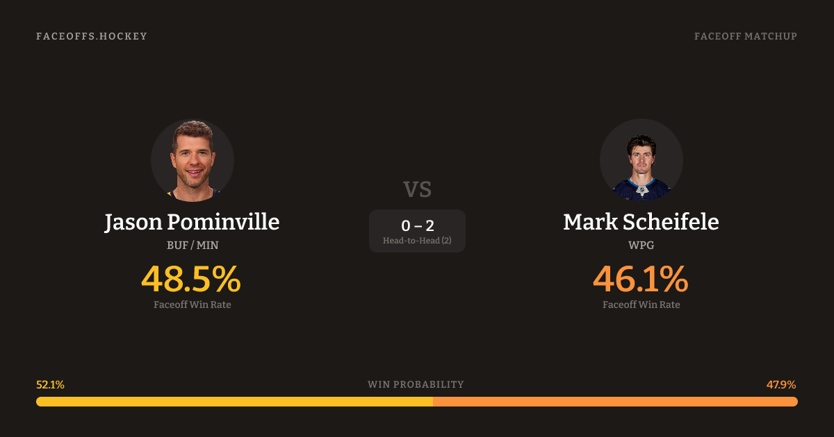 Jason Pominville holds a +1.7% FO% edge overall. Pominville wins 41.1% vs right-shot opponents — Scheifele shoots right.