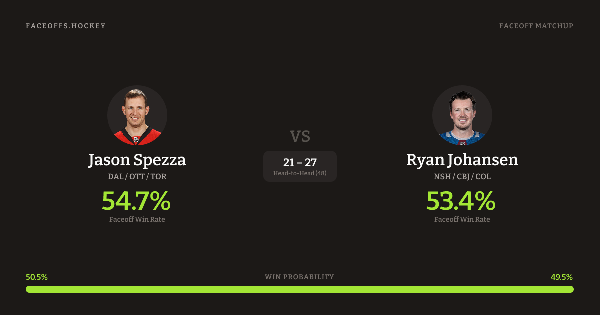 Jason Spezza holds a +1.3% FO% edge overall. Look for Johansen on offensive-zone draws (77% H2H, 17 meetings). Spezza wins 54.0% vs right-shot opponents — Johansen shoots right.