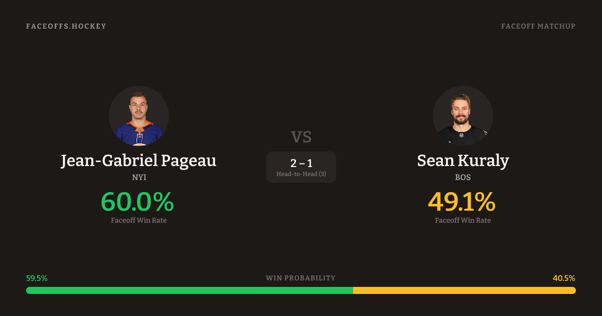 Jean-Gabriel Pageau holds a +21.5% FO% edge overall. Pageau wins 54.1% vs left-shot opponents — Kuraly shoots left.