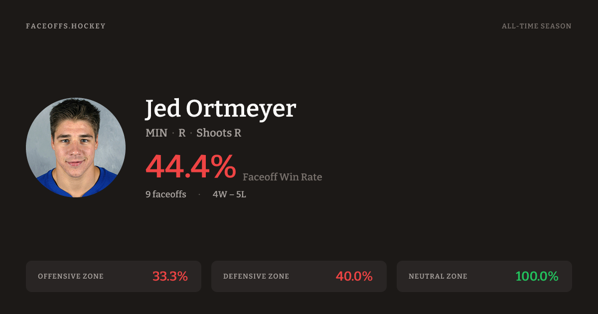 Jed Ortmeyer has a career faceoff win percentage of 44.4% across 9 faceoffs. Best zone: Neutral (100.0%).