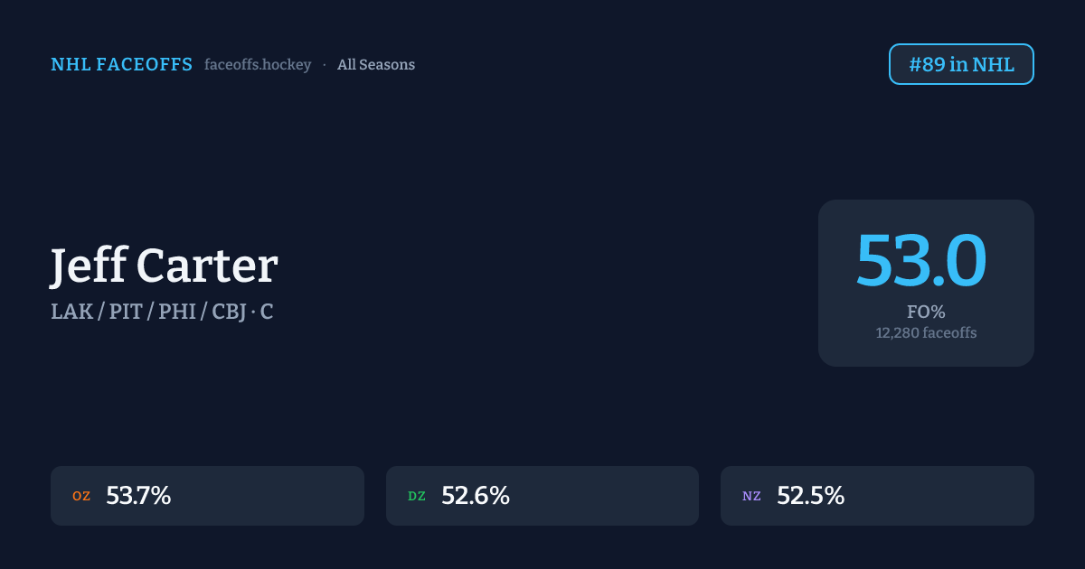 Jeff Carter has a 2021-22 faceoff win percentage of 57.5% across 1,235 faceoffs in the 2021-22 season. Best zone: Defensive (66.4%). Ranked #9 in the league.