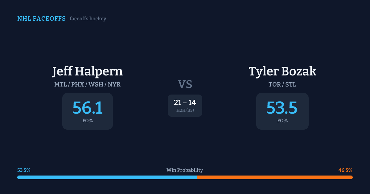 Jeff Halpern holds a +2.3% FO% edge overall. Look for Halpern on defensive-zone draws (78% H2H, 9 meetings). Halpern wins 58.0% vs right-shot opponents — Bozak shoots right.