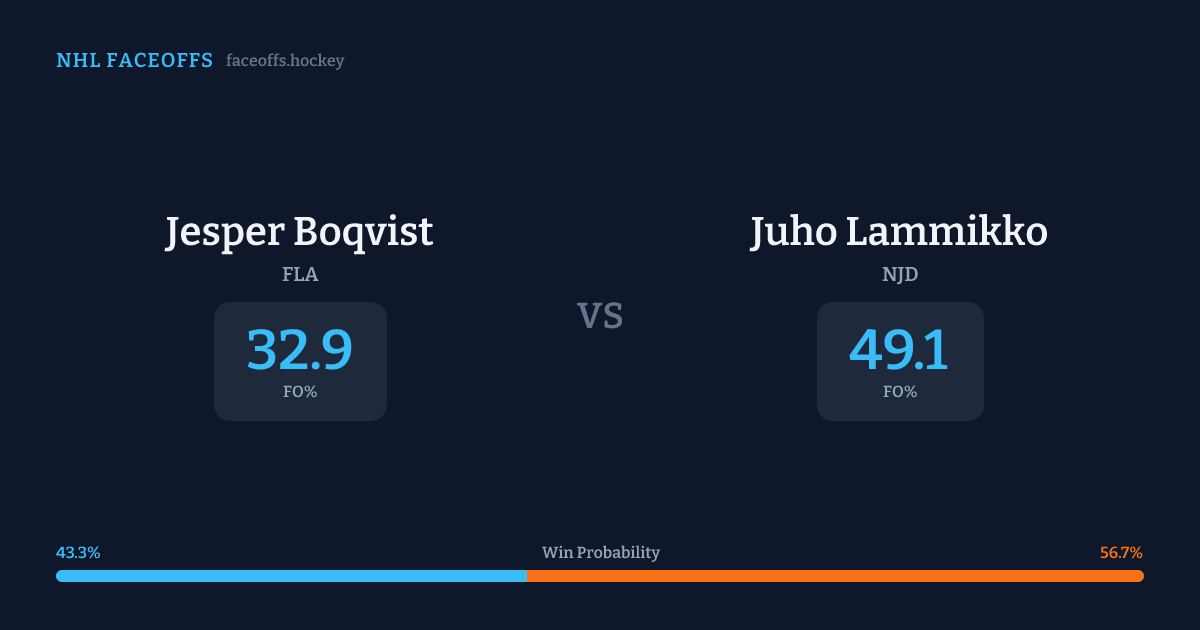 Juho Lammikko holds a +13.7% FO% edge overall. Look for Boqvist on neutral-zone draws (75% H2H, 4 meetings). Boqvist wins 40.1% vs left-shot opponents — Lammikko shoots left.
