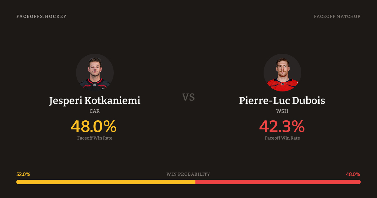 Jesperi Kotkaniemi holds a +4.4% FO% edge overall. Look for Kotkaniemi on neutral-zone draws (80% H2H, 5 meetings).