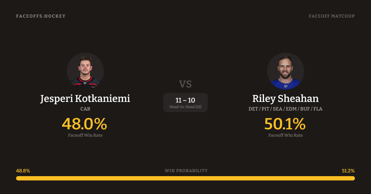 Riley Sheahan holds a +6.2% FO% edge overall. Look for Sheahan on neutral-zone draws (100% H2H, 3 meetings). Kotkaniemi wins 42.5% vs left-shot opponents — Sheahan shoots left.