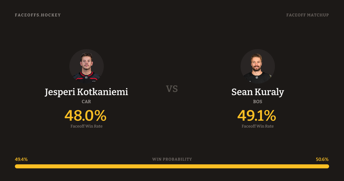Jesperi Kotkaniemi holds a +1.8% FO% edge overall. Look for Kuraly on neutral-zone draws (67% H2H, 3 meetings). Kotkaniemi wins 54.9% vs left-shot opponents — Kuraly shoots left.