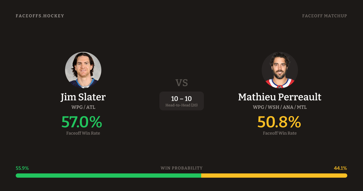 Jim Slater holds a +3.6% FO% edge overall. Look for Perreault on offensive-zone draws (100% H2H, 5 meetings). Slater wins 54.7% vs left-shot opponents — Perreault shoots left.